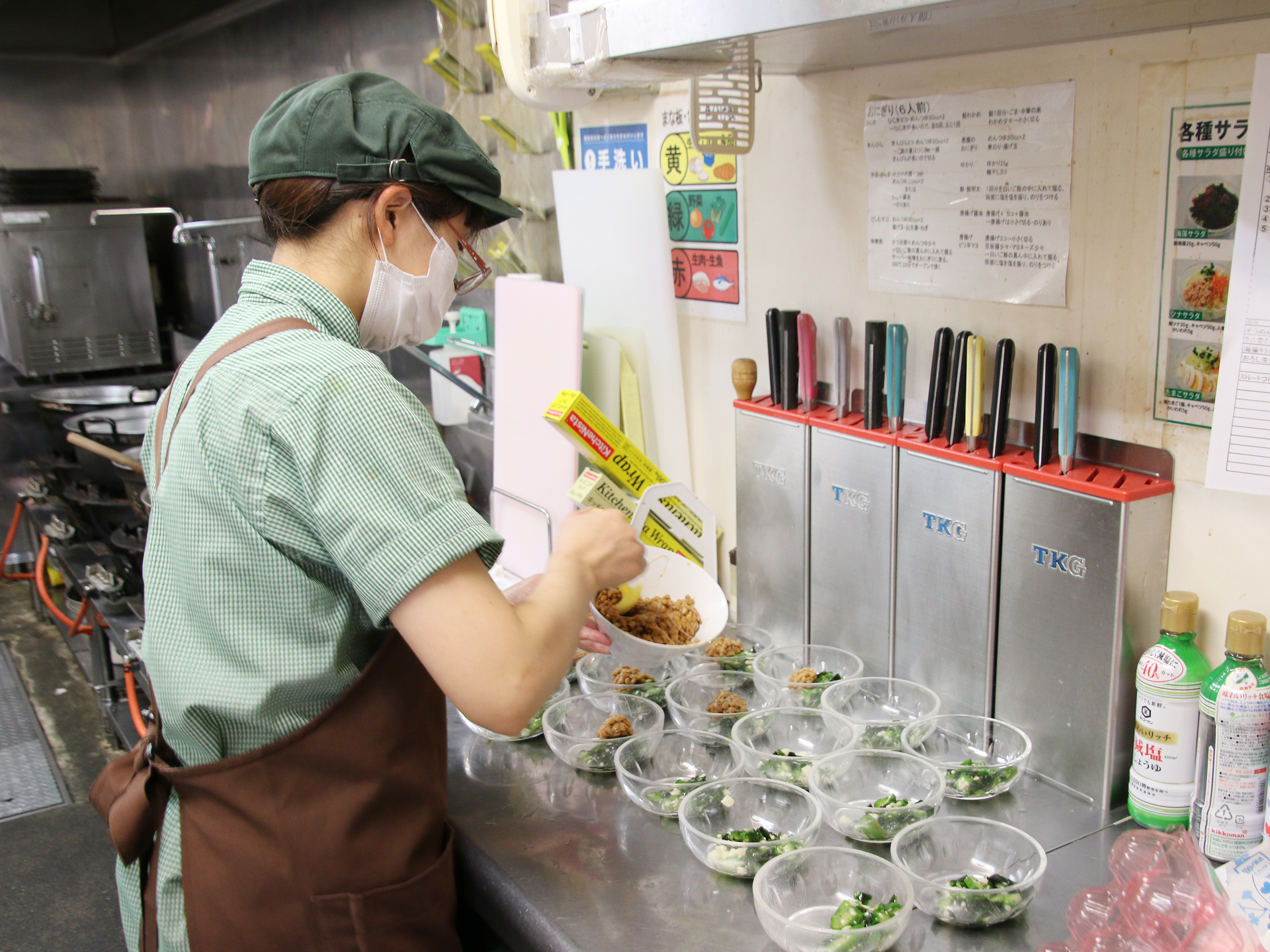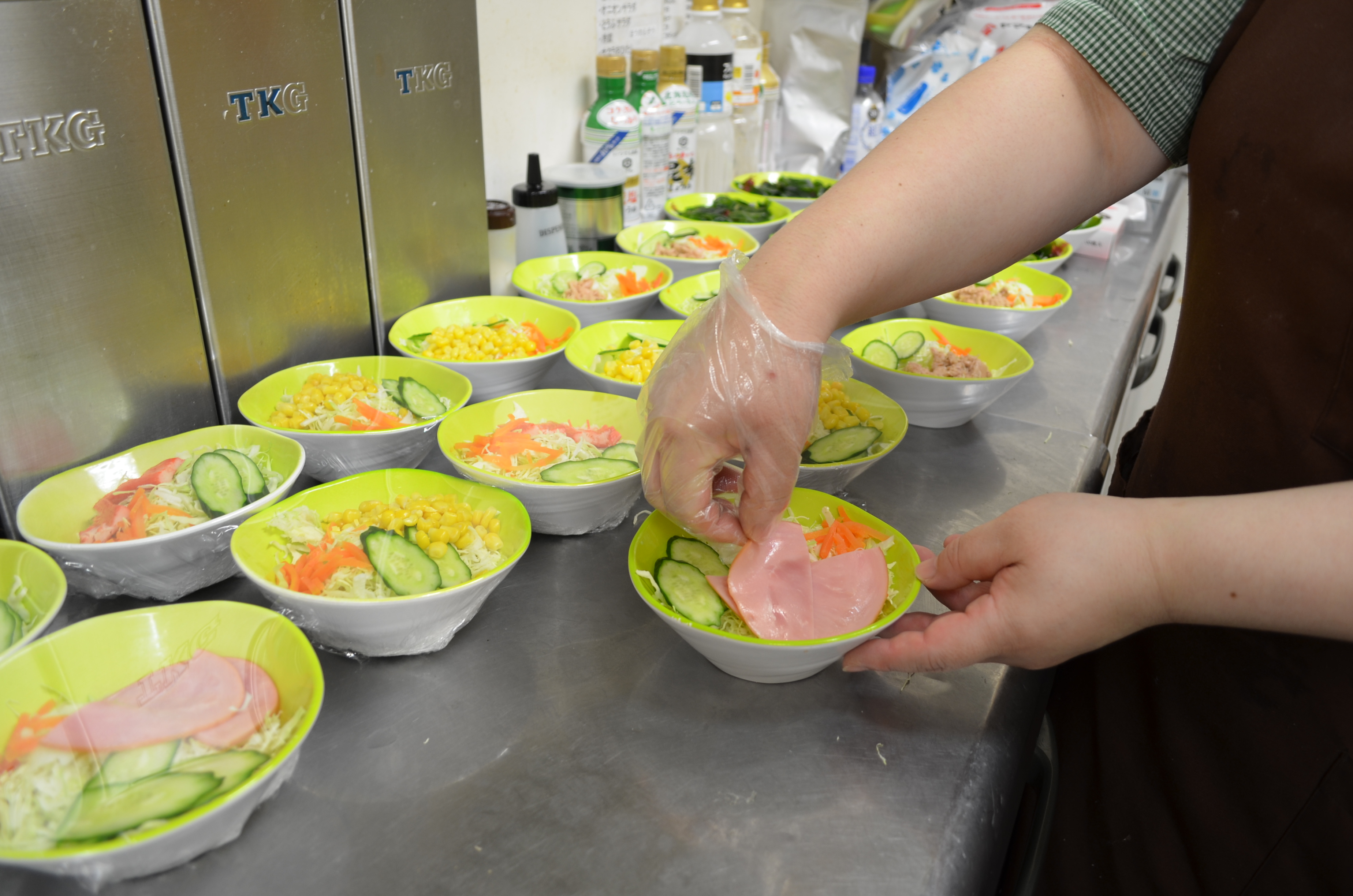 とても簡単な盛付のお仕事です。おかずや汁物、サラダをケースにセットするまでをお願いします。他、慣れてきたら簡単な調理やお会計、洗い物も徐々にお願いしていきます。