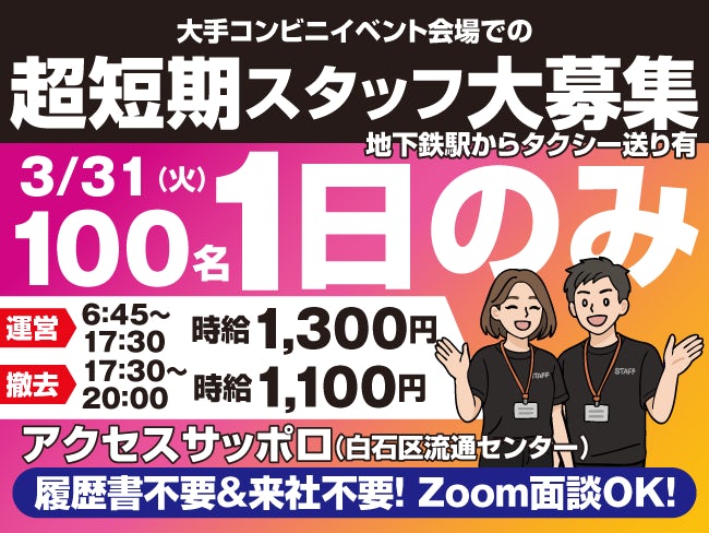 【株式会社バックスグループ 札幌支店/3139992602232】3/31限定大手コンビニイベント会場での運営スタッフのアルバイト・バイトの求人情報は、札幌のアルバイト・バイト求人情報【アルキタ】