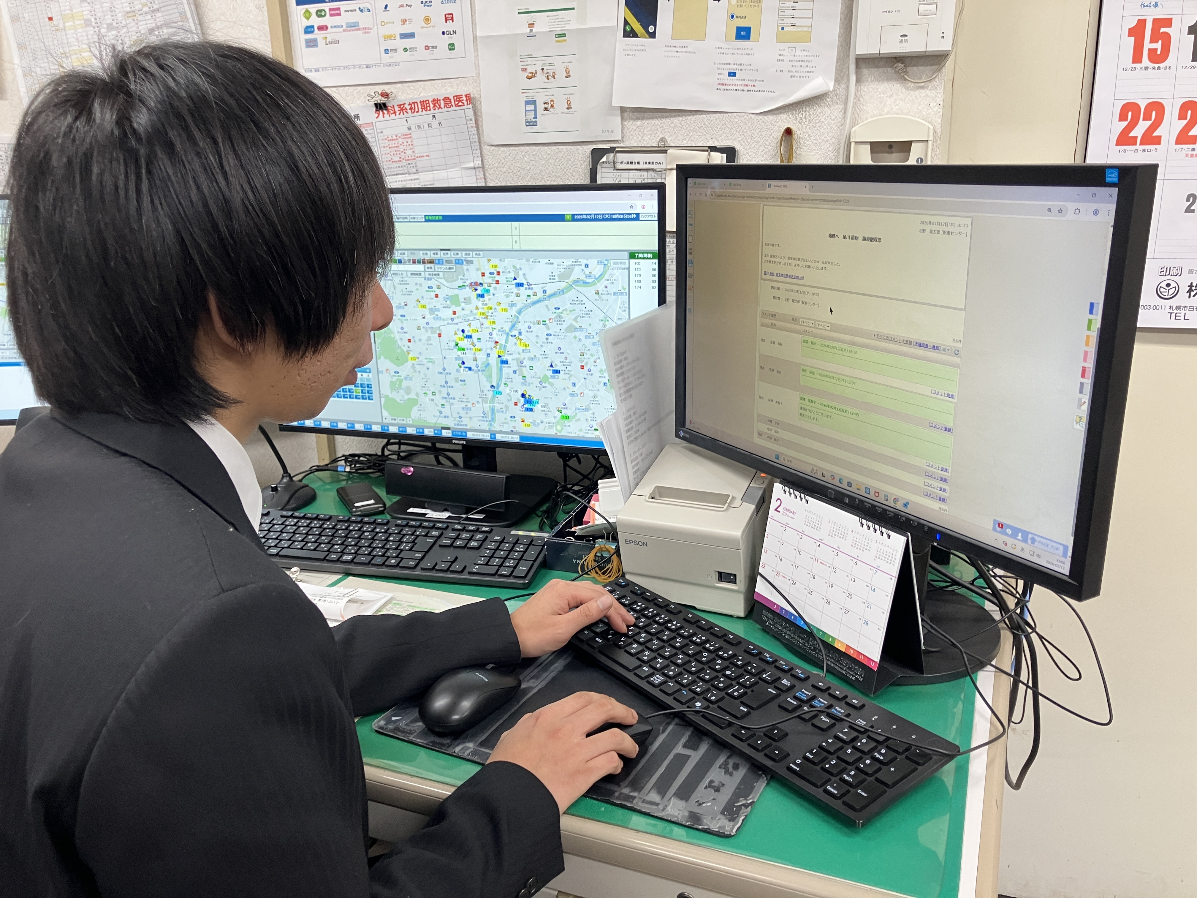 パソコン操作や電話応対が初めてでも大丈夫。まずは先輩と一緒に、操作だけ、電話だけ、と段階を踏んで研修。地図を使った配車の仕組みも、ゆっくり教えていきます。