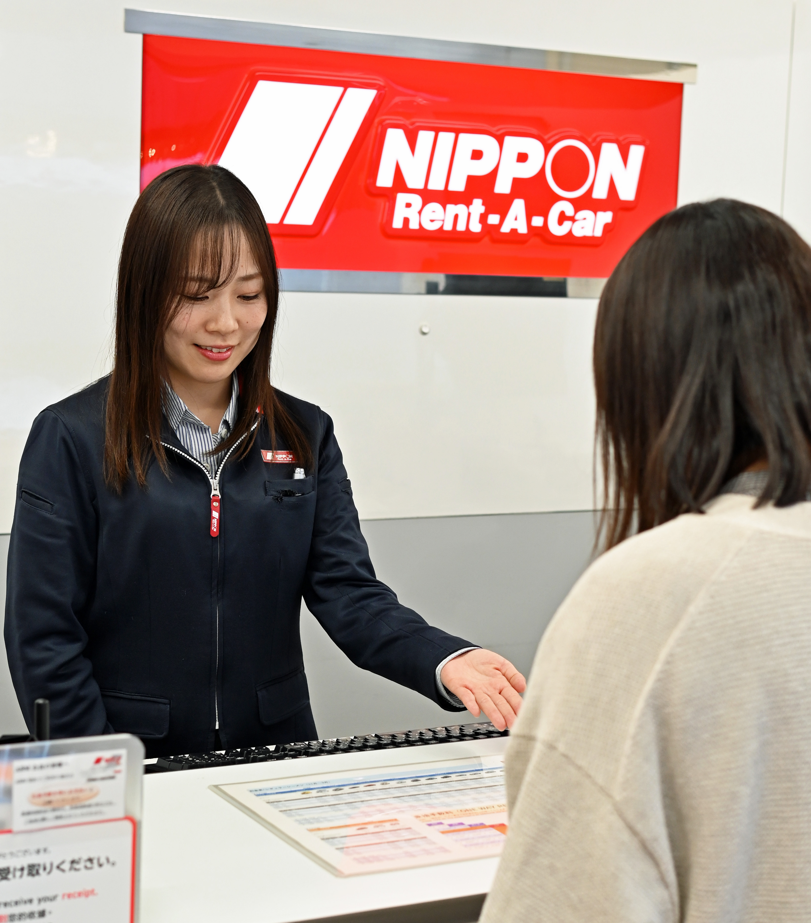 店舗へレンタカーを借りにきたお客様へ、プラン内容や補償の説明を行います。