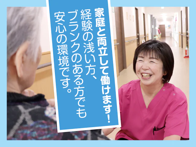 子どもの成長、家庭の状況などに合わせて働き方も変更可能◎時間を伸ばしたい、正社員になりたい、、そんな希望もOK!正社員になっても夜勤専門スタッフがいるので、夜勤は必須ではありません!
