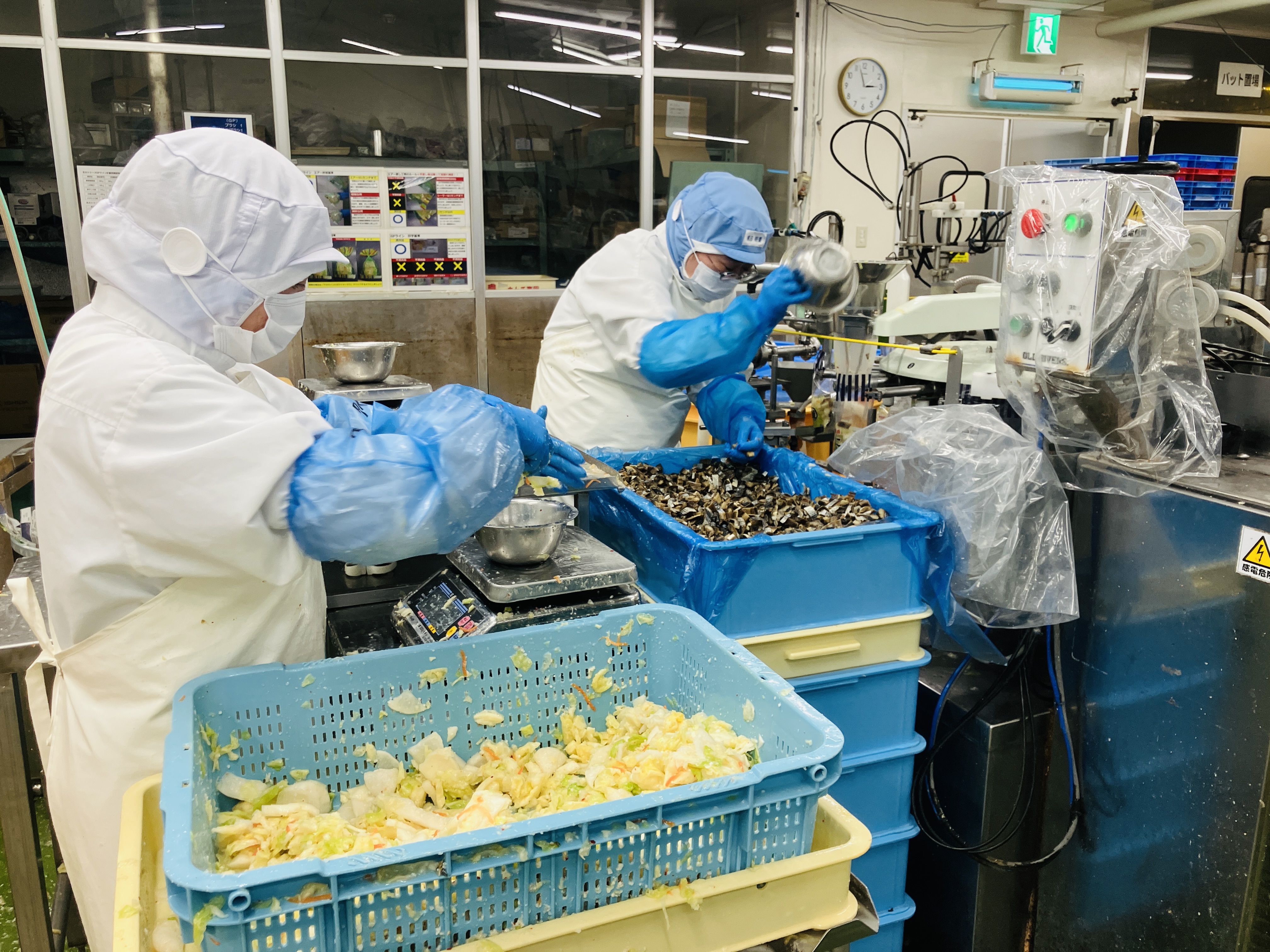工場内で、野菜を「切ったり」「計量したり」「包装したり」