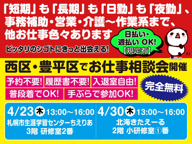 下記より希望の時間お選びください。 (a)8:00〜17:00(8:00〜15:00など応相談) (b)14:00〜22:30 (c)18:00〜23:00(19:00〜23:00など応相談) (d)24:30〜翌6:30(23:00〜翌6:00など応相談) ※繁忙期には早出、残業が発生する場合がありますのでご協力願います。