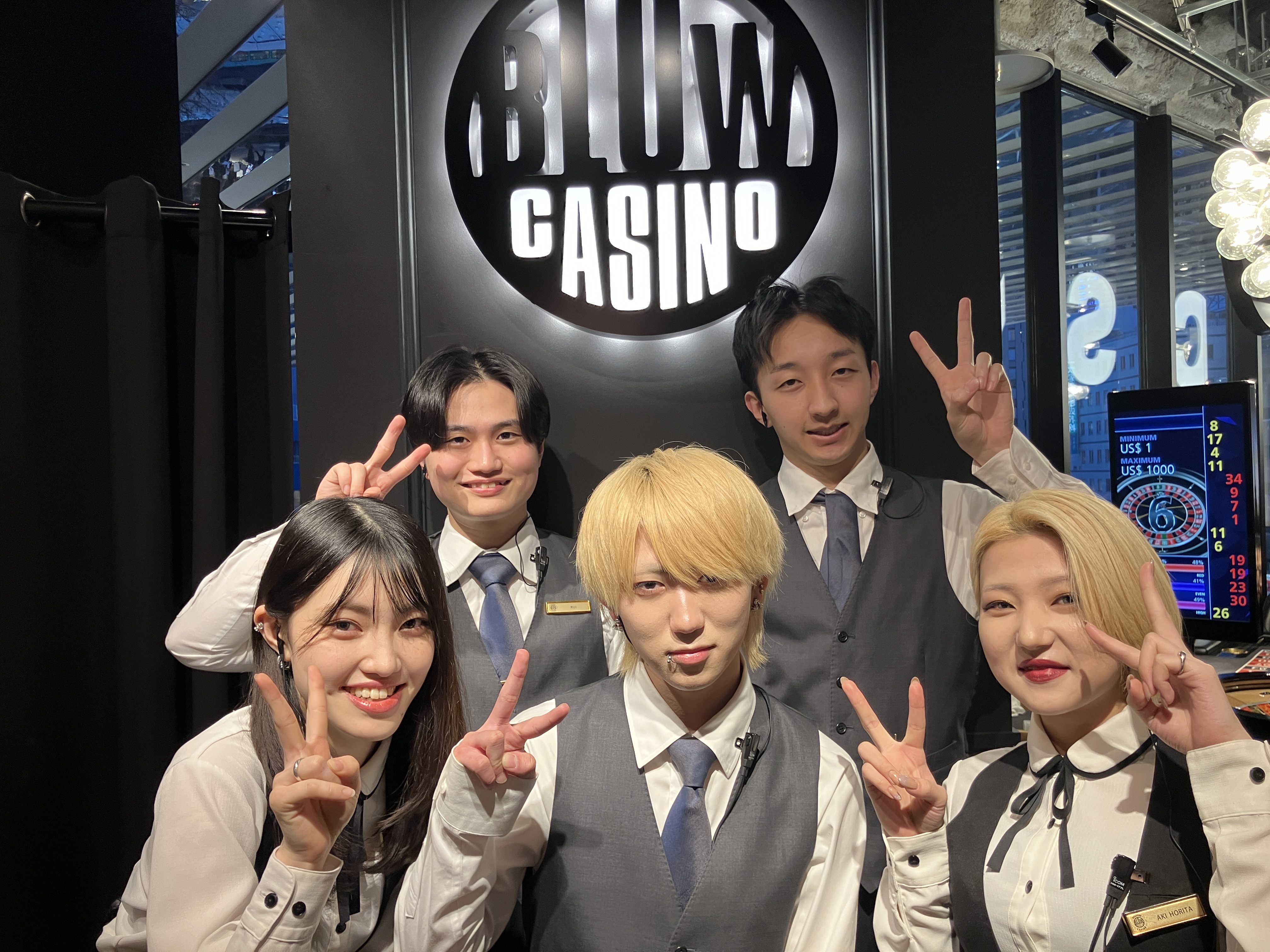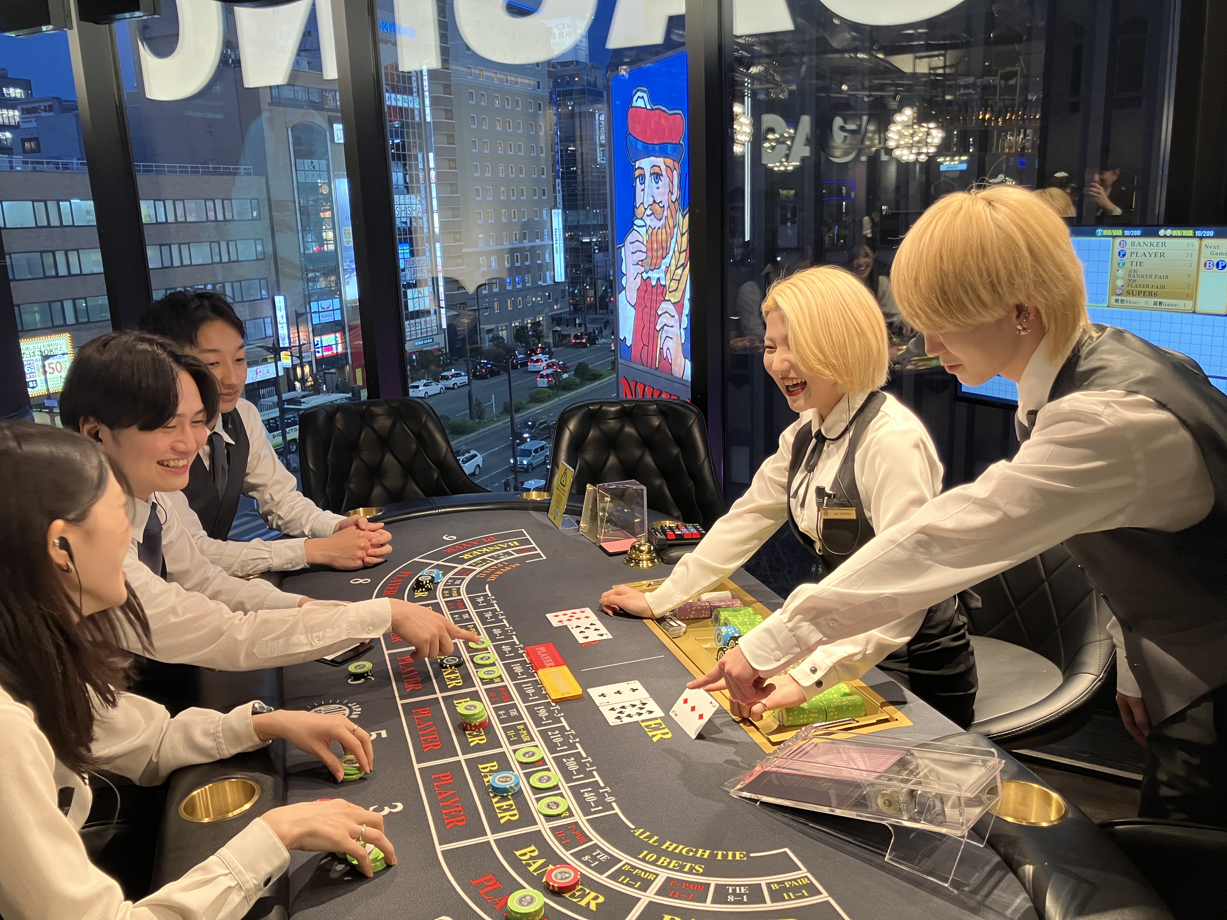 ほとんどが未経験のスタート。カジノゲームを全く知らない方でも、実際のゲームをやりながらルール・手順を覚えたり、お客様とのやりとりのコツ等教えます。年代が近い人が多いので、楽しみながら覚えられます。