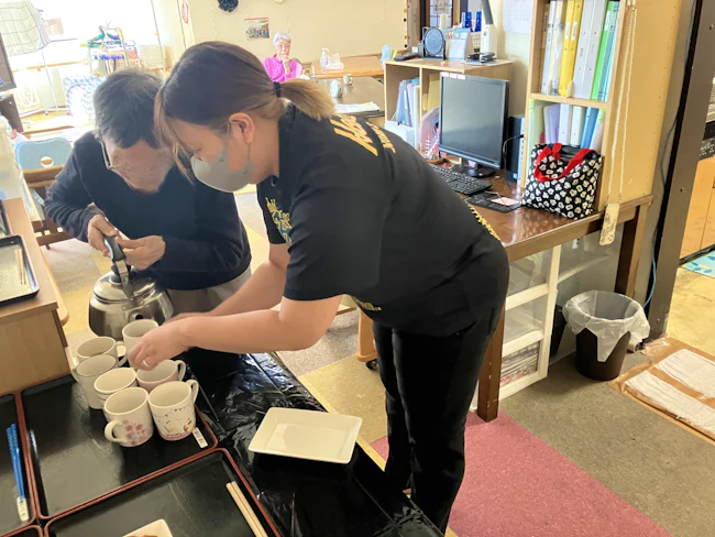 お茶をコップに注ぐのを見守っている一コマ。洗濯物を干したり・畳んだり・お部屋に持っていったりとできることは、自分で行うようにしています♪