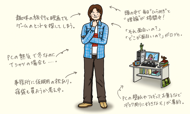 「ユーザーが求めるもの」を市場調査し、新しいゲームを創出するのがプランナー。アイデアを伝える企画書、「この場面でキャラがこう動く」などの制作指示を記した仕様書を書くスキルが重要となる。デザイナーやプログラマーと組んでシゴトをするため、幅広い知識が必要。